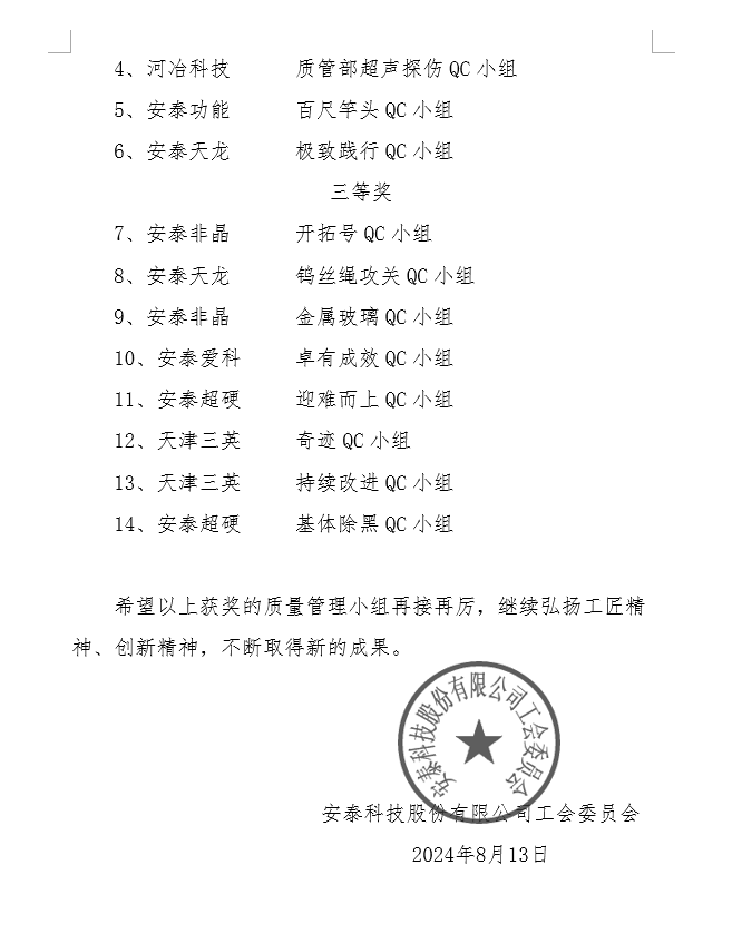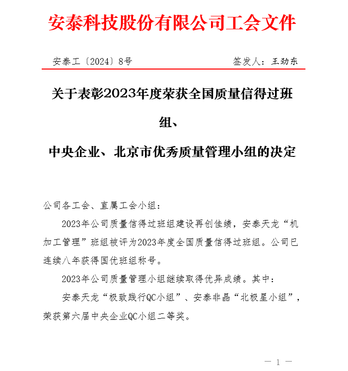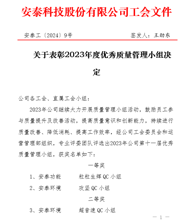 公司獲評2023年度安泰科技優(yōu)秀質(zhì)量管理小組