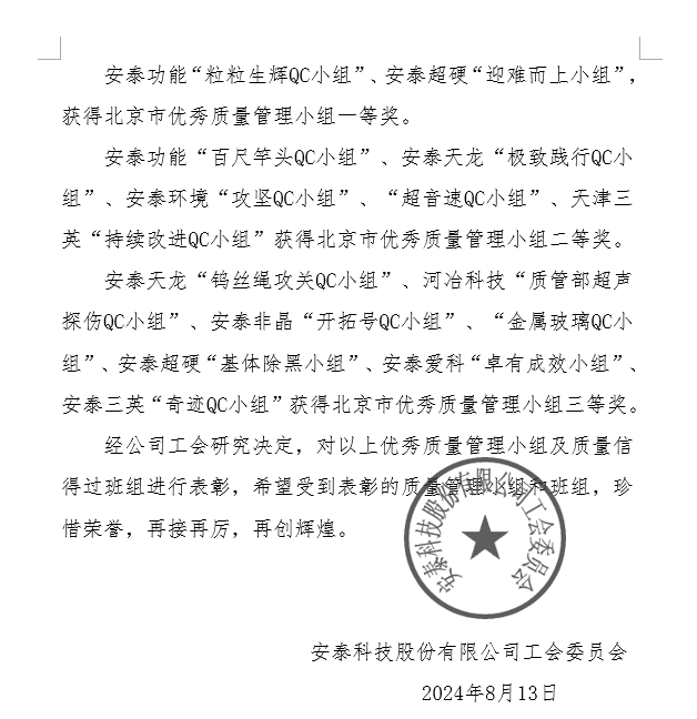 為鼓勵員工參與質(zhì)量提升及改善活動,提高質(zhì)量意識和創(chuàng)新能力,持續(xù)進(jìn)行質(zhì)量改善、降低消耗、提高工作效率,河冶科技-質(zhì)管部超聲探傷QC小組榮獲中央企業(yè)、北京市優(yōu)秀質(zhì)量管理小組三等獎, 2023年安泰科技第十一屆優(yōu)秀質(zhì)量管理小組二等獎。